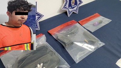 Elementos municipales que realizaban labores de prevención en el cruce de las calles Eslovaquia y Revolución Proletaria, en la colonia Campestre Virreyes, observaron a un masculino que manipulaba lo que aparentemente parecía ser un arma de fuego, mismo que al verse sorprendido intentó ocultarla dentro de una mochila.