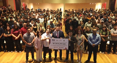 El Presidente Municipal, Cruz Pérez Cuéllar, entregó este día, de manera simbólica, el cheque por la cantidad de 2 millones 814 mil 201 pesos del programa de Becas para el Acceso a la Universidad, a las y los alumnos de la Universidad Tecnológica de Ciudad Juárez (UTCJ).