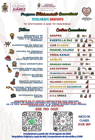 Agregó que estos cursos son gratuitos; quien desee más información puede acudir al Centro Comunitario más cercano o comunicarse vía WhatsApp al número de teléfono 656-150-0021.