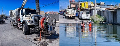 Para poder drenar el líquido, el personal de la Junta de Agua y Saneamiento entró al agua para ubicar la red de drenaje sanitario, el cual fue sondeado con un camión vactor para eliminar la obstrucción y permitir el flujo del agua de lluvia.