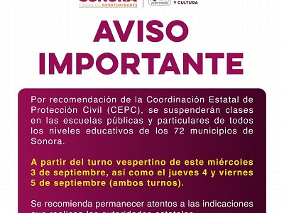 A partir del turno vespertino de este miércoles 3 de septiembre se suspenden clases en las escuelas públicas y particulares de todos los niveles educativos en los 72 municipios de Sonora, por recomendación de la Coordinación Estatal de Protección Civil (CEPC).