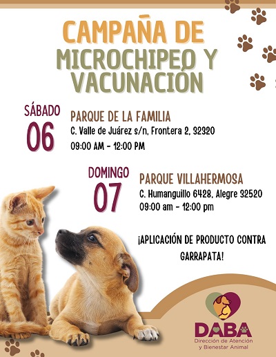 El próximo fin de semana se llevará a cabo de forma gratuita la campaña de microchipeo y vacunación antirrábica, por lo que la Dirección de Atención y Bienestar Animal (DABA), invita a los juarenses a llevar a sus mascotas.