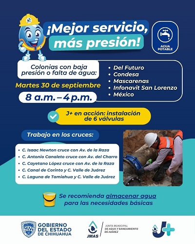 El Departamento de Eficiencia Física de la Junta de Agua y Saneamiento de Juárez, realizará la instalación de 6 válvulas nuevas, este martes 30 de septiembre, que permitirán un mejor control y suministro del agua que llega a los hogares juarenses.