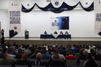 01 de octubre de 2025.- La Secretaría de Seguridad Pública Municipal, a través de la Unidad Mixta de Defensa legal y Atención Psicológica para Policías y sus familias (UDAPP) llevó a cabo la cuarta edición del conversatorio “Cambio y fuera con el estrés”, un espacio formativo y de reflexión dirigido a 220 elementos de Seguridad Pública, Coordinación Vial y Protección Civil.
