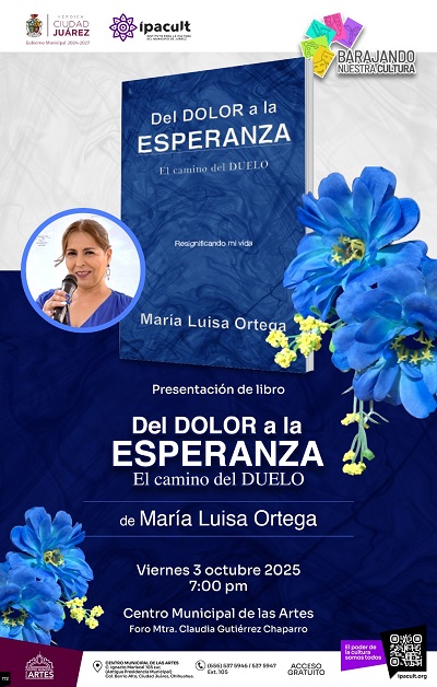 El Instituto para la Cultura del Municipio de Juárez (IPACULT) invita a la ciudadanía a la presentación del libro “Del dolor a la esperanza” de la tanatóloga María Luisa Ortega, que se llevará a cabo este viernes 3 de octubre a las 7:00 de la tarde en el foro Mtra. Claudia Gutiérrez Chaparro del Centro Municipal de las Artes (CMA).