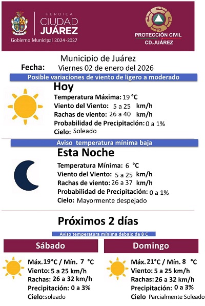 La Dirección General de Protección Civil del Municipio de Juárez informó el pronóstico meteorológico para este viernes 2 de enero de 2026, en el que se prevén condiciones mayormente estables, aunque con aviso por temperaturas mínimas bajas durante la noche y madrugada.