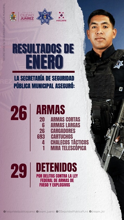 A 02 de febrero de 2026.- La Secretaría de Seguridad Pública Municipal dio a conocer que, durante el mes de enero del presente año, fueron aseguradas 26 armas de fuego de distintos calibres, como resultado de diversas intervenciones y operativos especiales realizados en la ciudad.