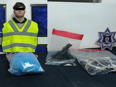 A 05 de febrero de 2026.- Elementos de la Secretaría de Seguridad Pública Municipal arrestaron a Cristopher Yahir G. D., por su presunta responsabilidad en la comisión de delitos contra la salud y contra de la ley federal de armas de fuego y explosivos.