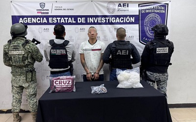 La detención de la citada persona, con apoyo de elementos de la Guardia Nacional y del Ejército Mexicano, fue en las calles De Los Palacios y De Los Adoquines, del fraccionamiento Colonial del Sur, traía consigo 4.480 kilogramos de metanfetaminas, distribuidos en 8 bolsas de plástico, así como de un arma de fuego, abastecida con cartuchos útiles, calibre 22mm.