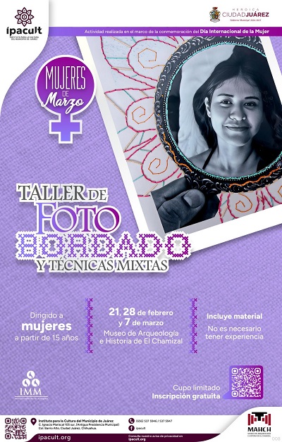 El Instituto para la Cultura del Municipio de Juárez (IPACULT) invita a mujeres a partir de los 15 años a participar en el taller Mujeres de Marzo: Fotobordado y Técnicas Mixtas, una propuesta formativa que vincula la creación artística con procesos de reflexión personal y colectiva, en el marco de la conmemoración del Día Internacional de la Mujer.