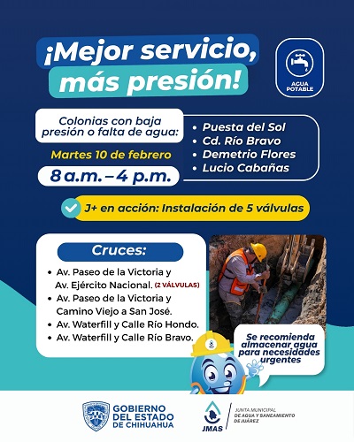 09 de febrero 2026, 2:15 pm La Junta de Agua y Saneamiento de Juárez, a través del departamento de Eficiencia Física, realizará la instalación de 5 válvulas de seccionamiento, este martes 10 de febrero, que permitirán un mejor control y suministro del agua que llega a los hogares juarenses.
