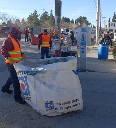 Las cuadrillas de la Dirección de Limpia llevan a cabo labores de limpieza en el ejido Samalayuca, luego de los festejos realizados en la comunidad el fin de semana, los cuales generaron acumulación de residuos.