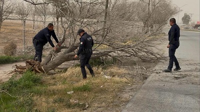A 18 de febrero de 2026.- Ante la contingencia generada por los fuertes vientos registrados en las últimas horas, elementos de la Secretaría de Seguridad Pública Municipal (SSPM) llevaron a cabo recorridos preventivos en las vialidades con mayor tránsito vehicular y peatonal, así como acciones para el retiro de árboles y objetos que representaban riesgo para la ciudadanía.