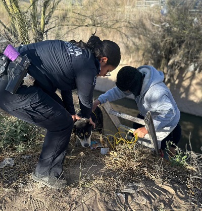 A 20 de febrero de 2026-. Elementos de la Secretaría de Seguridad Pública Municipal, adscritos a la Estación de Policía del Distrito Centro, brindaron apoyo en el rescate de un perro que se encontraba atrapado en un canal de aguas negras, en hechos registrados en la colonia Bellavista.