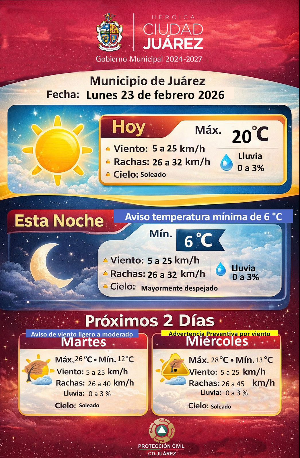 La Dirección General de Protección Civil del Municipio informó que para este lunes 23 de febrero se prevé un día soleado, con una temperatura máxima de 20 grados centígrados y una probabilidad de lluvia de entre 0 y 3 por ciento.