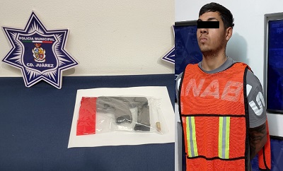 Tras abordarlo conforme a los protocolos de actuación policial y realizarle una inspección preventiva, le fue asegurada entre sus pertenencias un arma de fuego calibre 9 milímetros, con un cargador abastecido con un cartucho útil, quedando bajo detención.