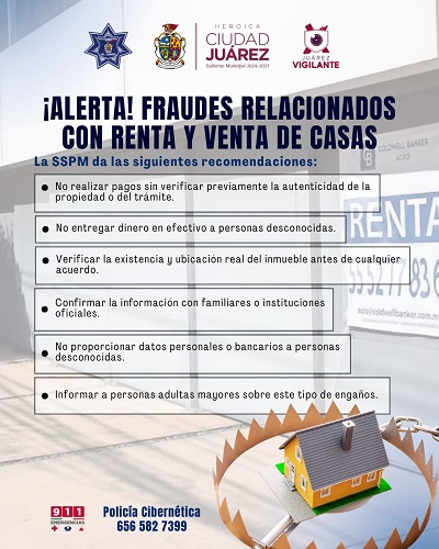 A 17 de marzo de 2026.- La Secretaría de Seguridad Pública Municipal, a través de la Dirección de Investigación y del Área de Delitos Cibernéticos, alerta a la ciudadanía sobre una modalidad de fraude relacionada con la supuesta renta o venta de viviendas, generada a través de anuncios digitales o físicos.