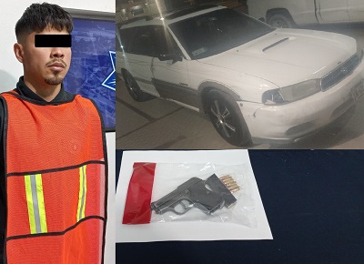 Por lo que fue abordado por protocolos de seguridad y, al realizarle una inspección preventiva, fue localizada en el interior del automotor un arma de fuego calibre .25, con un cargador abastecido con seis cartuchos útiles, procediendo con su detención.